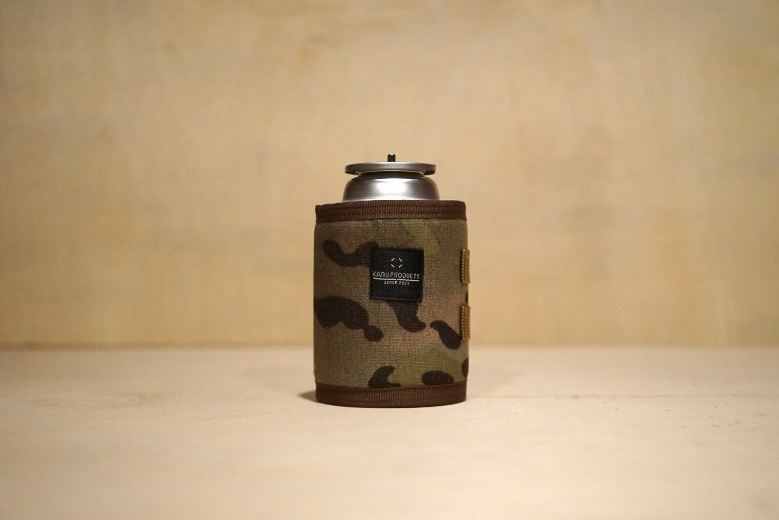 オリジナルブランド「∴KAMU」。kamu(カム)はアイヌ語で【覆う】。アメリカのインビスタ社が製造販売している素材 CORDURA 250 を使用した、イワタニカセットガスジュニア専用カバー。迷彩の一枚物から切り出しているので、同じ柄は一つとしてありません。