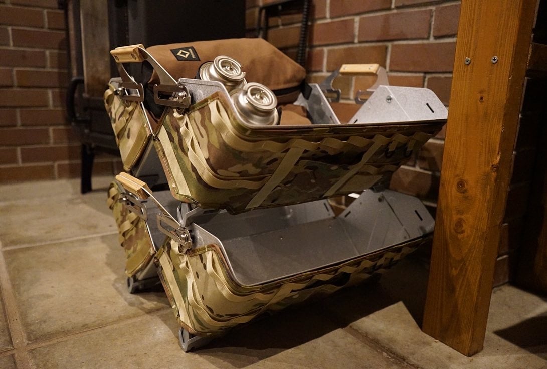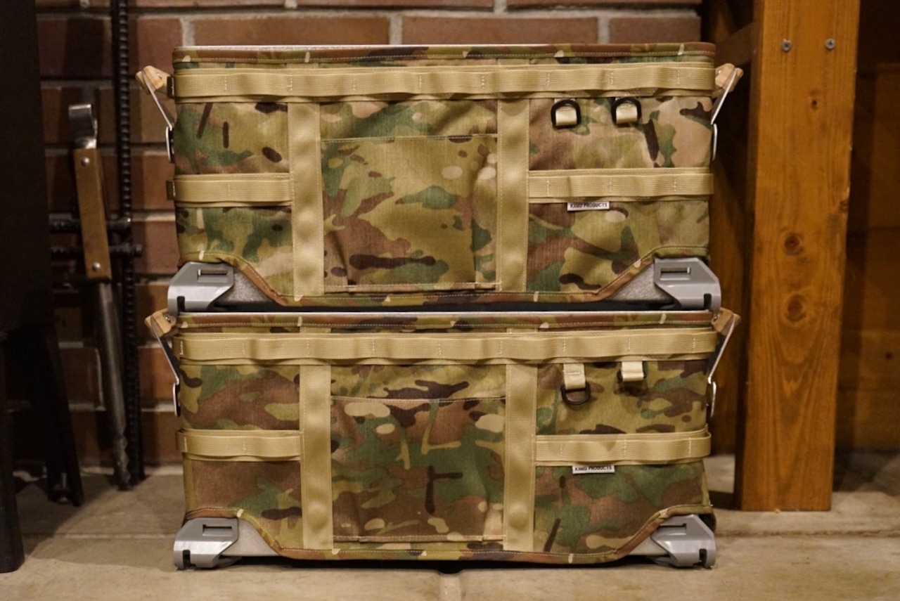 アメリカのインビスタ社が製造販売している素材 CORDURA 500 を使用した、スノーピークのシェルコン25専用カバー。迷彩の1枚物の生地から切り出しているので、同じ柄は一つとしてありません。