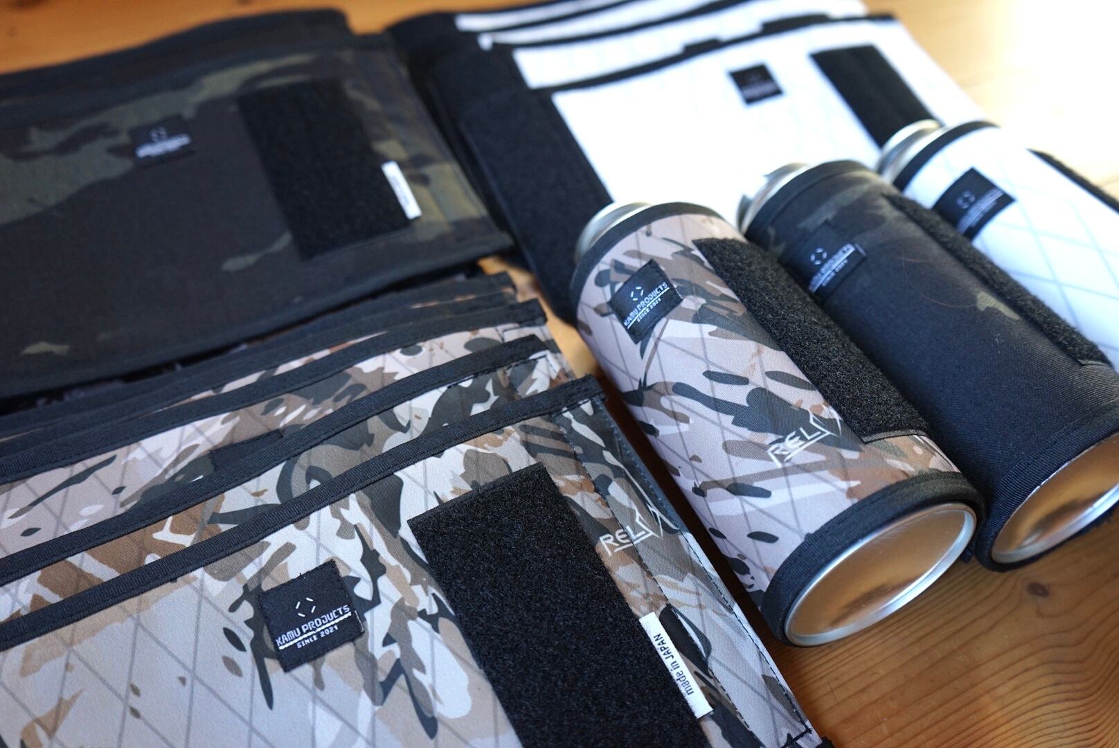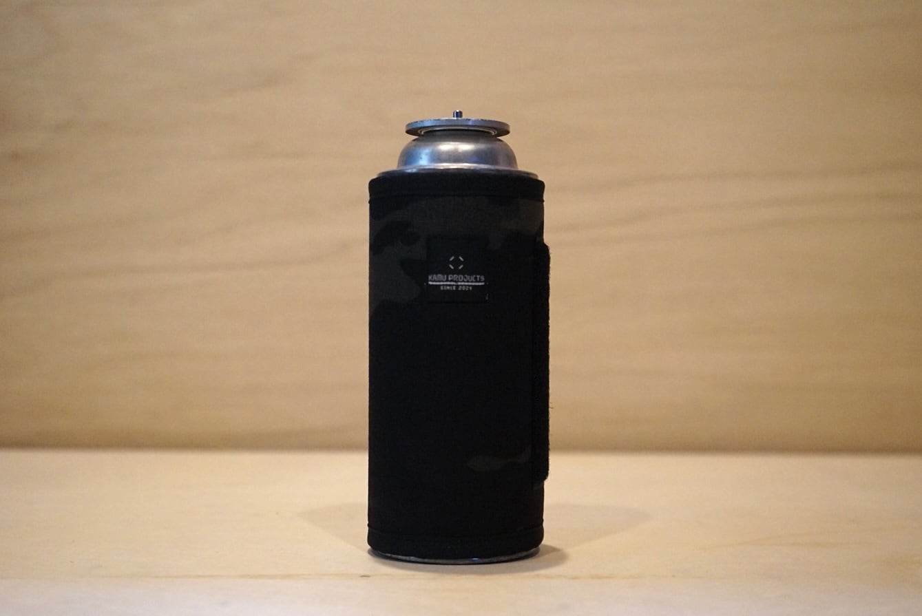 オリジナルブランド「∴KAMU」。kamu(カム)はアイヌ語で【覆う】。アメリカのインビスタ社が製造販売している素材 CORDURA 500 を使用した、CB缶専用カバー。迷彩の一枚物から切り出しているので、同じ柄は一つとしてありません。