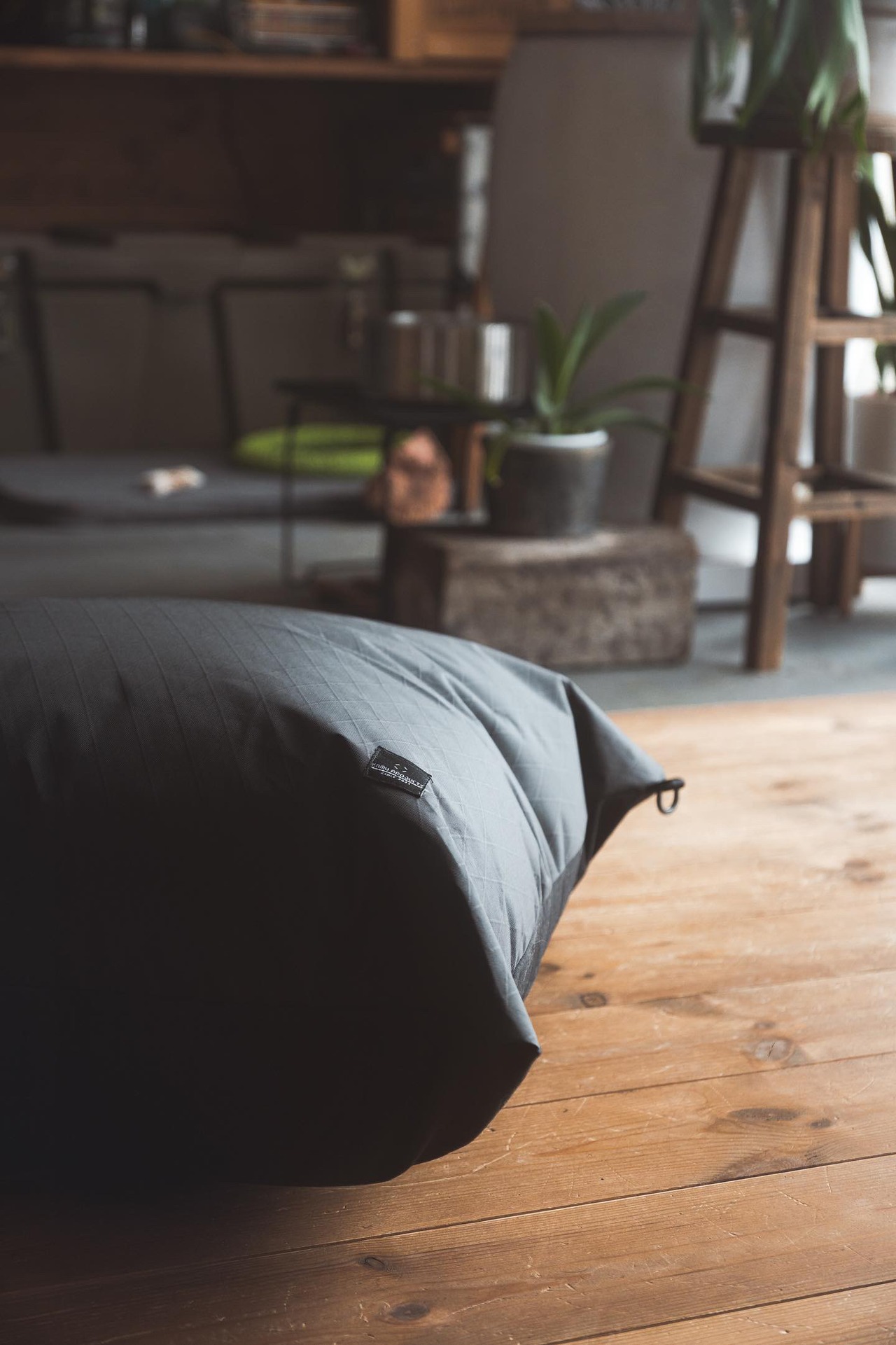 オリジナルブランド「∴KAMU」。kamu(カム)はアイヌ語で【覆う】。XPACを使用した、シュラフケース兼クッション。裏地にはコットンとナイロンの混紡糸を使用したリップストップ生地の2種類を使用したアウトドアクッション。